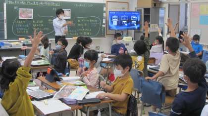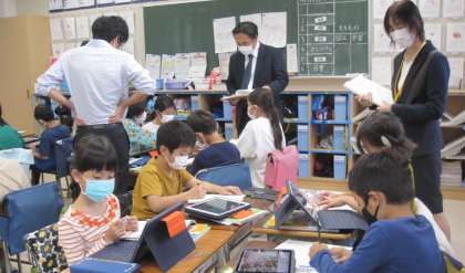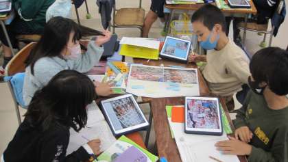 『わたしたちのくらしとお店の仕事』の導入の授業です。朝の魚売り場と夕方の魚売り場の写真を見て、気付いたこと、疑問に思ったことをノートに書き、グループで意見交換しました。
