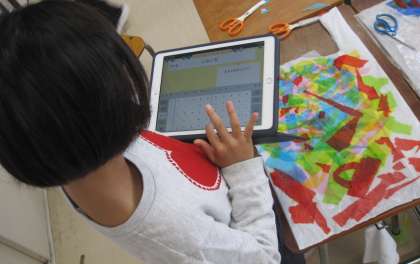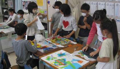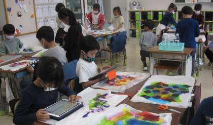 『のりのり おはながみで』 表現活動を楽しんでいます。ちぎったり、はさみで切ったりしたお花紙を、並べ方や重ね方を色々と工夫して表現しました。題名を考え、おすすめポイントを入力して、ロイロノートで担任に送りました。