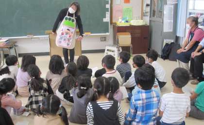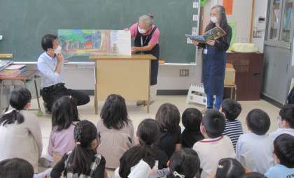 大型絵本やエプロンシアターで子どもたちは、物語の世界へ…。尾山台図書館の方に大変お世話になりました。