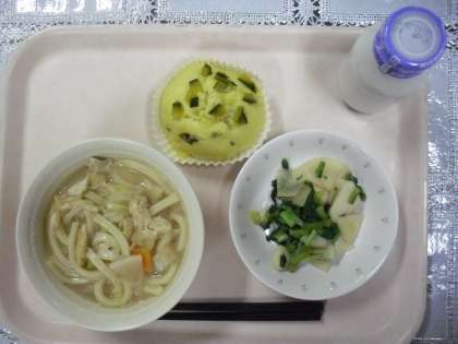 今日のメニューは、味噌煮込みうどん、株のゆず醤油、カボチャの小豆蒸しパン、牛乳でした。