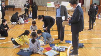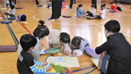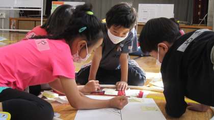 思考ツールを活用し、付箋に書いたことを「つくるもの」「相談すること」「練習すること」に整理しました。取り組む内容ごとにグループ編成をしています。魚釣り、こま、めいろ、けん玉、ボーリング、玉入れ、まとあてなどのグループがあります。