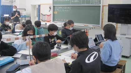 『てこのしくみとはたらき』の学習をしています。実験てこを使って、水平につり合うときのきまりを見つけていきました。実験結果をもとにして、考察しました。