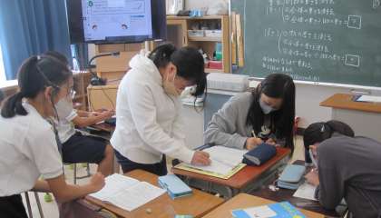 課題は「画用紙の束を1枚ずつ数えずに、全部で何枚あるかを調べる方法を考えよう」です。自分たちが考えた方法で、グループごとに計測し、合計枚数を求めました。調べて、画用紙の枚数が分かったときには、飛び跳ねて喜んでいるグループもありました。