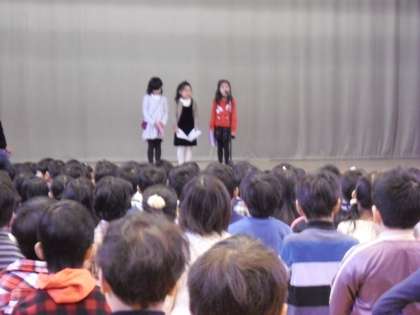 終業式で1年生の児童が、自分の生活を振り返り、新しい年への抱負を何も見ないで、自分の言葉で話しました。とてもりっぱの態度でした。