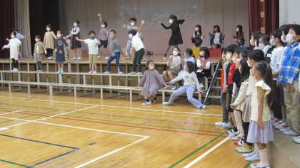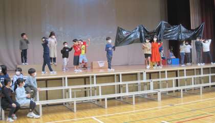 2年生の演目は『スイミー』 舞台で伸び伸び表現しています。声が大きく、動きがダイナミックです。