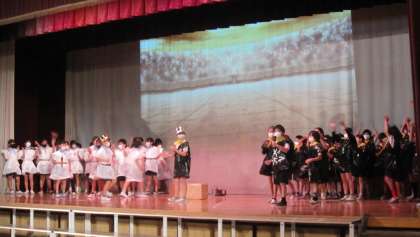4年生の演目は『ねらわれた魂』です。自分たちで作成した衣装を身につけて演じました。ラップ隊もリズムに乗ってきました。