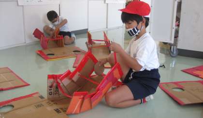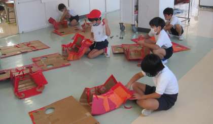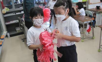 衣装の伊勢海老や小道具のボンボンを作っています。準備は着々と進んでいます。