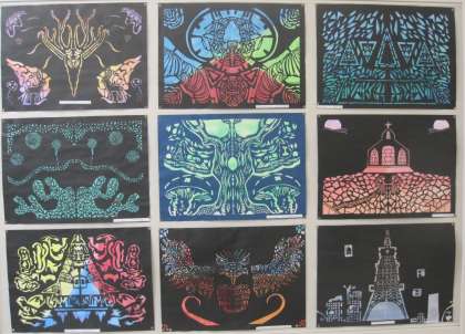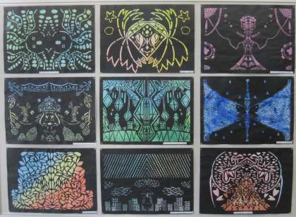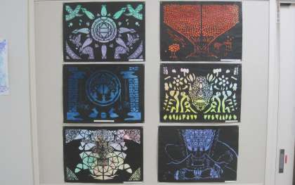 『切って開いて見つける形』半分に折った紙を小さくカッターナイフで切り取るところからはじめます。折った紙を広げてみると左右同じ模様ができます。折って、切って、開いて…、を繰り返しながら表したい形を見つけました。切り絵の楽しさや難しさを感じながら、イメージを広げ、自分だけの世界をつくり上げました。作品は、職員室前に掲示しています。