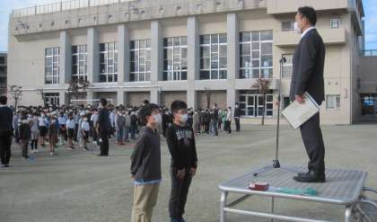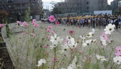 全校朝会のあいさつは、いつも6年生がリードしています。学校長は、学芸会に向けての子どもたちのめあてを紹介しました。立冬を迎えましたが、コスモスの花が、まだきれいに咲いています。