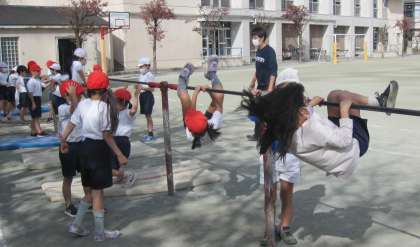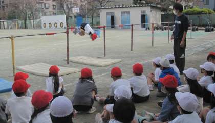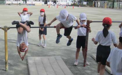 回転したり、逆さになったりして、鉄棒に親しみました。新しくできるようになったことを喜んでいました。友達の紹介で全体の場で発表しました。