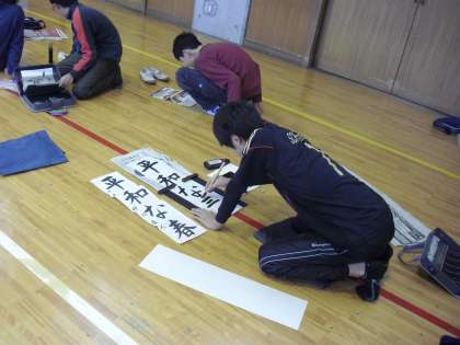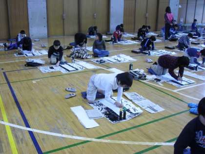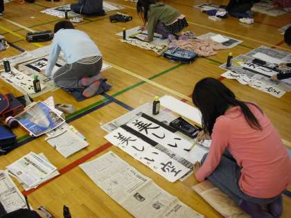 昨日かき初め大会を行いました。体育館で3年生以上の子どもたちは、3時間目から6時間目を分けて1字1字気持を込めて書きました。3年生は「つよい力」4年生は「美しい空」5年生は「豊かな心」6年生は「平和な春」を書きました。