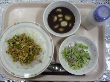 金曜日のメニューは、そぼろ丼、野菜のゆかりかけ、白玉しるこ、牛乳でした。
