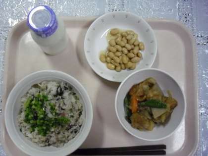 梅茶漬け、鶏と根菜の揚げ煮、ぶどう豆、牛乳でした。美味しく頂きました。