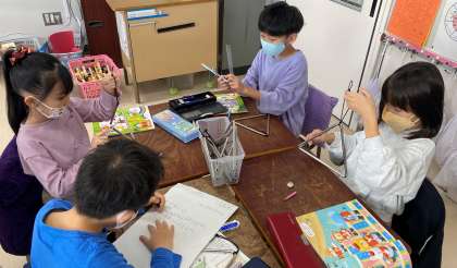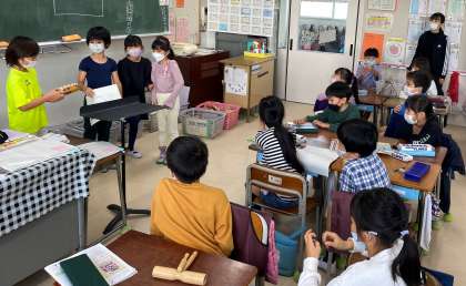 『だがっき パーティー』の学習を進めています。グループごとに、ウッドブロック、クラベス、カスタネット、トライアングル、すず、小太鼓、タンブリンの楽器を『楽器店』として担当し、楽器の色、見た目、形、どんな音がするのかなど、鳴らしてみて気が付いたことを書いていきました。楽器の音を鳴らしながら発表し、全体の場で共有しました。