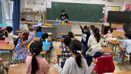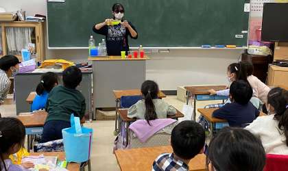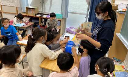 担任が変装したちょいわる先生の登場に子どもたちは大喜びです。形の違う2つのペットボトルのジュースの量は、どちらのボトルの方が多いのか、ちょいわる先生が子どもたちに提示します。子どもたちが考えた比べ方で実験しました。