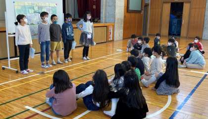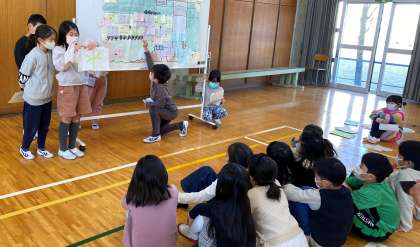 「多摩川の魅力を伝えよう」の発表会です。多摩川へ行き体験したことをもとにして、調べてまとめた内容を2年生に伝えました。とても緊張して丁寧に発表している姿が印象的でした。