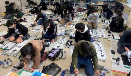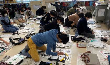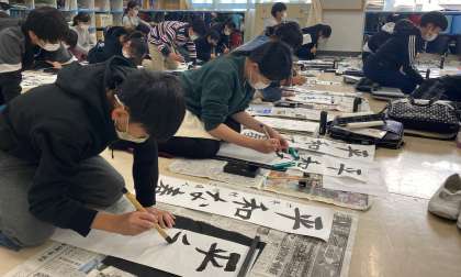 書き初め『平和な春』の練習に取り組んでいます。張り詰めた空気の中で、子どもたちは真剣に文字を書いていました。