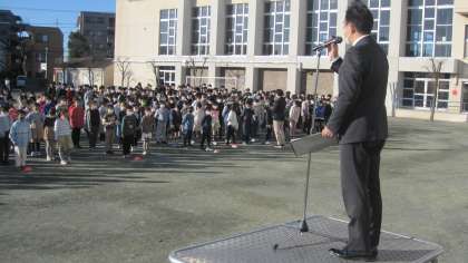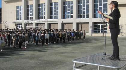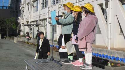 雲一つない青空の下、2学期終業式を行いました。校長は、子どもたちが2学期に努力したことや活躍したこと、できるようになったことを担任が書いた、通知表の所見から紹介しました。1年生の代表児童は、2学期に努力してやり遂げたことなどを発表しました。最後に全校児童全員で校歌を歌いました。全校で校歌を歌うのは3年ぶりになります。