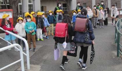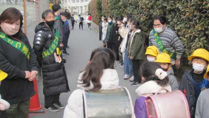 PTA保護者の皆様にもご協力をいただき、正門、東門であいさつ運動を行っています。3学期は、1年生と6年生が担当しています。元気なあいさつが響いています。