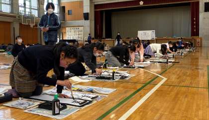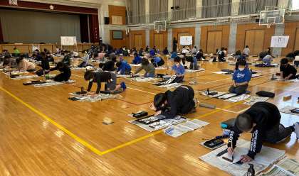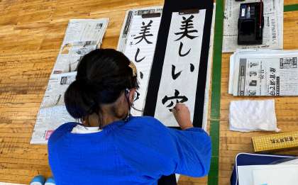 「美しい空」を文字の中心、画と画の間に注意して書きました。心地よい和楽器の演奏が子どもたちの集中力を高めていました。