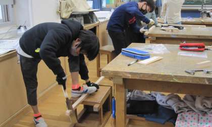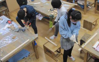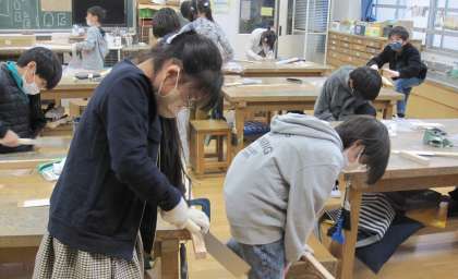 「90cmの大工さん」の学習、第1時間目。今日のめあては『道具の扱い方をマスターして、工夫して角材を切ろう』です。子どもたちは、安全に留意しながら熱心に取り組んでいました。