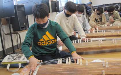 地域の方3名の講師の先生をお招きしての授業です。箏の歴史、座り方、弾き方について学び、「さくらさくら」の演奏に挑戦しました。授業の終わりには、弾くことができるようになりました。子どもたちの熱心な取り組みに、講師の先生からお褒めの言葉をいただきました。