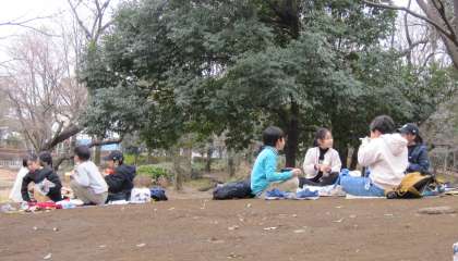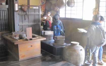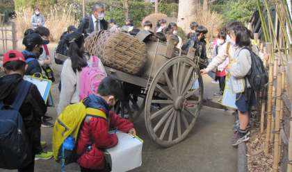 大八車の大きさにびっくり。名前の由来などについて学びました。お弁当を食べる頃は、曇りになり、とても寒くなってきましたが、グループの友達と楽しそうに食べていました。
