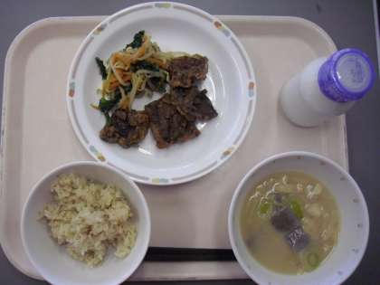 昨日のメニューは、茶飯、クジラの竜田揚げ、おひたし、ご汁、牛乳でした。