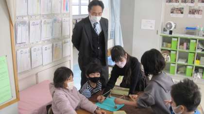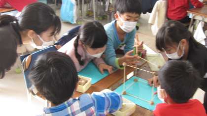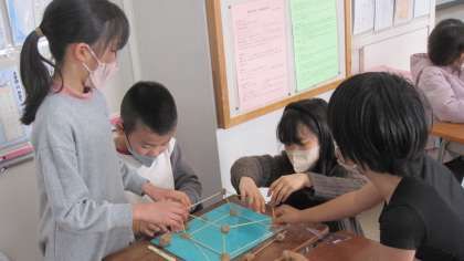 「はこの形」の学習をしています。正方形で囲まれた「はこの形」を長方形で囲まれた形にするには、どうしたらよいか意見を出し合い、竹ひごと粘土を使って作りました。