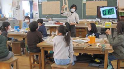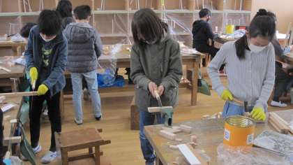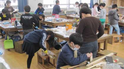 「90cmの大工さん」の学習2時間目の授業です。釘やボンド、紙パーツを使って前時に切った角材を組み合わせてくっつけていきました。