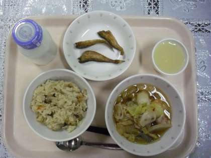 今日のメニューは、キノコご飯、はたはたのから揚げ、きりたんぽ汁、リンゴゼリー、牛乳でした。秋田の郷土料理です。お知らせを掲載します。ご覧ください。