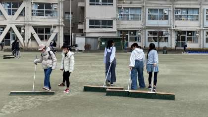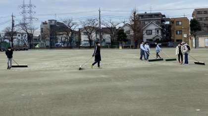 運動委員の当番が校庭整備をしています。ブラシを使って活動し、校庭全体が美しく整いました。