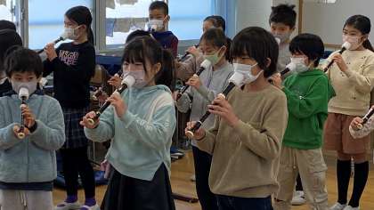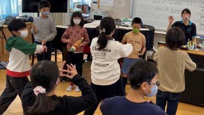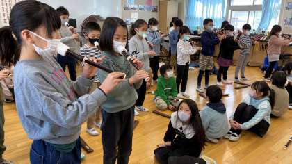「リコーダー・タイム」では、タンギングの技法を用いて、演奏しました。最後に、ボンゴのリズムに合わせて、拍に乗ることを意識して動きました。