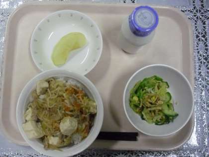 肉豆腐丼、ごぼうチップサラダ、リンゴ、牛乳 でした。