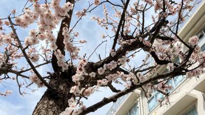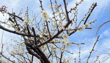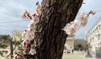 校庭には、桜の花、梅の花が咲いています。