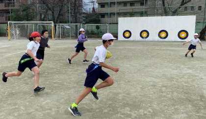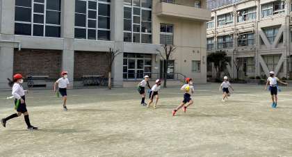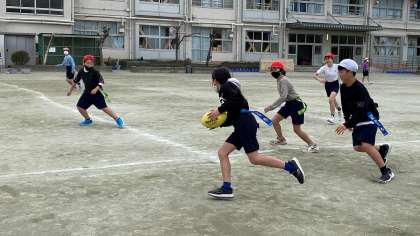タグラグビーの学習を進めています。ラグビーボールやタグラグビーのルールにも慣れ、トライするための作戦を考えて、楽しみながらゲームをしていました。