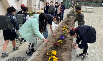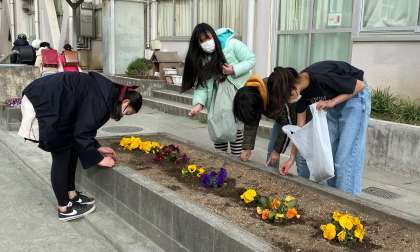 朝、一番に登校して、花壇の水やりをしたり、花がら摘みをしたりしています。チームワークよく、取り組んでいました。