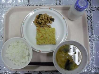 10日金曜日のメニューは、ご飯、切干大根の卵焼き、昆布豆、味噌汁、牛乳でした。