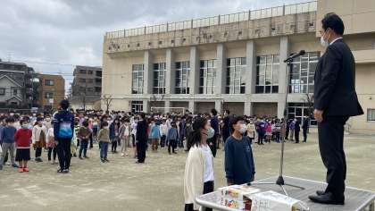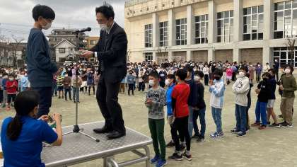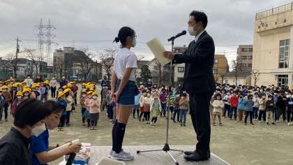 校長は、WBCで活躍しているヌートバー選手のパフォーマンス『ペッパーミル』の由来についてお話しました。次に、環境日記コンテストに入選した児童、東京都美術展覧会に図工作品、書写作品が展示された児童、書道展で特選の児童、サッカー、柔道大会で活躍した児童の表彰を行いました。
