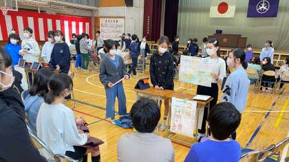 『玉堤の未来を考える〜玉堤CSR〜』 先日保護者に発表した内容を5年生に向けて発表しました。5年生は、来年度の「総合的な学習の時間」の学習内容をイメージすることができました。