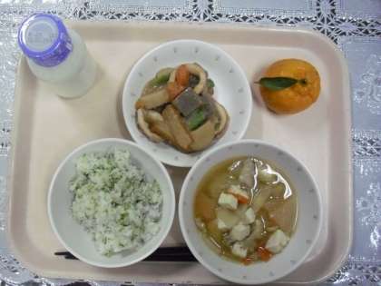 昨日のメニューは、じゃこと青海苔のご飯、イカと里芋のうま煮、豚汁、ポンカン、牛乳でした。
