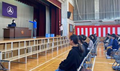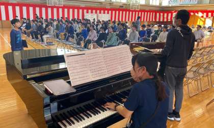 本番をイメージし、証書渡しの練習をしています。張り詰めた緊張感が伝わってきます。音楽専科教諭のピアノの生演奏が涙を誘います。楽曲は各クラス、担任の雰囲気に合わせて選曲しています。