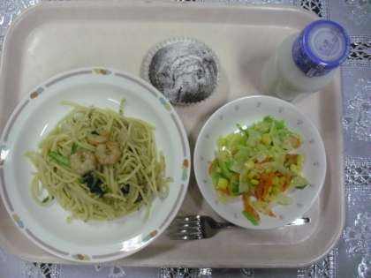 昨日のメニューは、小松菜とベーコンのスパゲティ、コーンサラダ、チョコケーキ、牛乳でした。