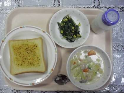 今日のメニューは、ガーリックトースト、白菜のシチュー、ほうれん草のソテー、牛乳でした。