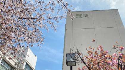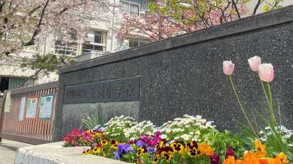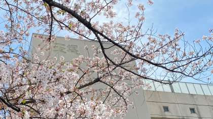 校舎敷地内の桜の花が明日の始業式、入学式を応援します。本校の校章は桜の花びらの形をしています。花びらは二重になっていて、厚さ、深み、まるさを表現しています。いく本かのめしべ、おしべは、玉堤小の子どもたちを表しています。