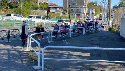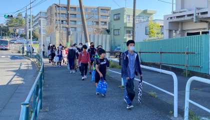 今年度から1年生〜6年生の集団登校を再開しました。上級生が下級生に声をかけながら登校しています。PTA郊外委員の皆様にお世話になっています。
