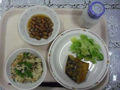 今日のメニューは、五目ごはん、サバの竜田揚げ、ひとしお野菜、煮豆、牛乳でした。