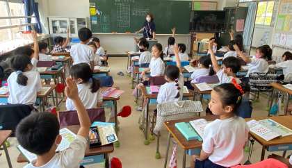 「表とグラフ」の学習をしています。果物の数を表やグラフに表すことで、その後の問いにすぐに答えることができました。