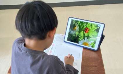 「はるがいっぱい」の学習をすすめています。iPadで写真を撮り、見つけた春を絵と文で表現しました。