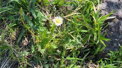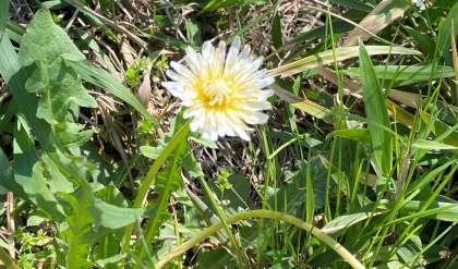 築山にたくさんの黄色い西洋タンポポが咲いています。白いタンポポを発見!調べてみると、日本の在来種「シロバナタンポポ」でした。